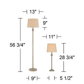 Show more Illuminate your home with the exquisite charm of our Lamps Plus lamp set, boasting a combination of elegance and functionality. This stunning ensemble includes one floor lamp standing at an impressive 56 3/4 inches high, complemented by two matching table lamps that reach a height of 28 3/4 inches. The carefully crafted beige finish and cream fabric shades give a touch of antique allure to any decor, making them perfect for enhancing your bedroom or living room ambiance.