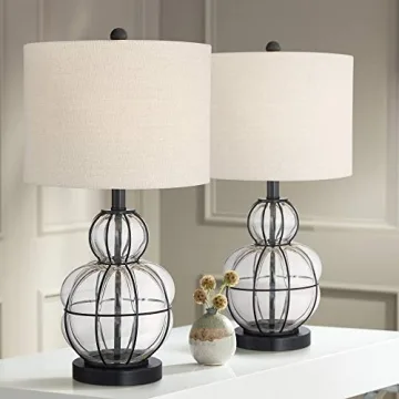Illuminate your living space with the **360 Lighting Eric Rustic Table Lamps**, a stunning set of two that seamlessly blends farmhouse charm with modern style. Standing 24 inches high, these lamps are designed with clear blown glass gourd bodies and a dark bronze finish metal frame, exuding elegance and sophistication. Each lamp is crowned with a stylish burlap fabric drum shade that measures 9 1/4 inches high by 13 inches wide, providing a warm and inviting glow. These lamps are not just decorative pieces;...