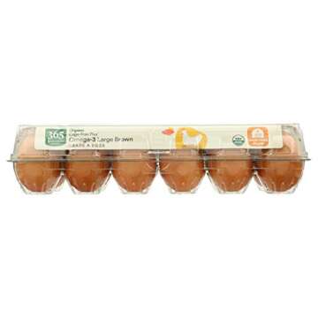 Show moreElevate your breakfast with the **365 by Whole Foods Market Organic Brown Omega 3 Large Eggs**. These eggs offer more than just nutritional benefits; they bring a *dance-down-the-aisles* feeling right to your kitchen. Sourced from farms that prioritize animal welfare, these eggs are cage-free, ensuring that the hens are treated with care and respect, while also providing you with a product that supports sustainable farming practices. With no antibiotics or animal by-products in their diet, you can trust that each egg is packed with premium quality and taste.