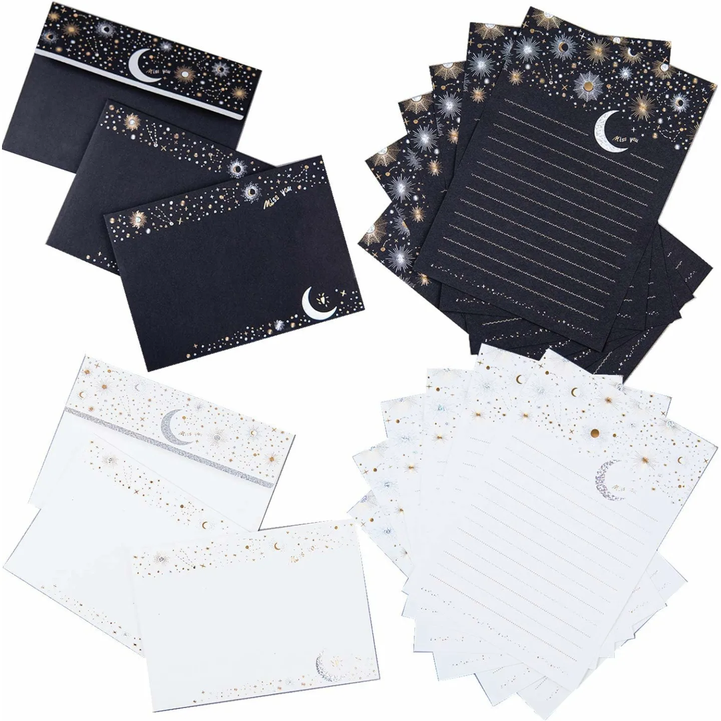 Compared to other stationery sets in the market, this starry sky letter writing set excels in both quality and design. While many products may offer attractive designs, they often compromise on paper thickness and durability. Our set, on the other hand, provides thick, high-grade paper that allows for smooth writing without ink bleeding. The unique metallic bronzing and thematic crescent moon adds unparalleled charm, making it superior to standard letter papers and envelopes. The rave reviews by satisfied users further establish this set's exceptional value and appeal.
