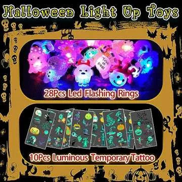 38Pcs Halloween Party Favors for Kids, 3D Light Up Rings Bulk Toys Halloween Treats Non Candy, 28 Led Flashing Rings & 10 Luminous Tattoos, Halloween Goodie Bag Fillers Glow In The Dark Party Supplies