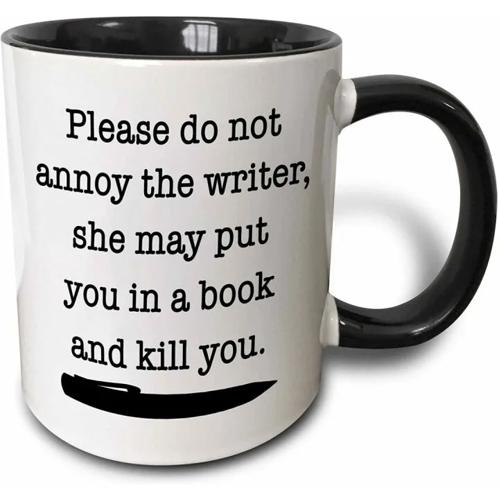 While the cup is on the smaller side at 11 ounces, it's still perfect for a quick caffeine fix. The black details and artwork on the mug are sure to inspire you, especially when dealing with annoying people in your life. And if you prefer a larger mug, it makes a great pen holder or desk accessory. This mug is dishwasher safe for easy cleaning, making it a durable addition to your collection. If you're a writer who loves to collect fun coffee mugs or know someone who fits the bill, our beloved cup is the perfect addition to your routine. Order now and add some fun and inspiration to your daily cup of joe!