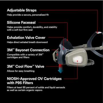 Show more The 3M Professional Half Mask Respirator is your ultimate companion for safety and comfort in hazardous work environments. Engineered with a NIOSH-APPROVED 6001 cartridge and P95 filters, this respirator offers exceptional protection against organic vapors and harmful particulates. Its innovative cool flow valve directs exhaled breath downward, ensuring maximum comfort during long hours of wear. With a lightweight, silicone faceseal, you'll experience premium comfort without the burden of heavy equipment.