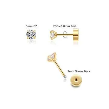 Show more Introducing our beautifully crafted Small Screw Back CZ Cartilage Piercing Jewelry, a perfect blend of elegance and safety. These exquisite 3mm Tiny CZ Screw on Flat Back Stud Earrings are designed for ultimate comfort and style, ideal for anyone looking to add a touch of sparkle to their everyday or special occasion outfits. Seriously durable and beautiful, these earrings feature a unique screw back design, ensuring that the backs stay firmly in place, whether you’re sleeping, swimming, or enjoying any adventurous activity. Made with 316L surgical steel, forget about nickel or lead allergies; these earrings are nickel-free and lead-free, making them perfect for sensitive ears. With their scintillating cubic zirconia stones sparkling brilliantly against a gold finish, they provide an effortless elegance suitable for stacking in helix or tragus piercings too.