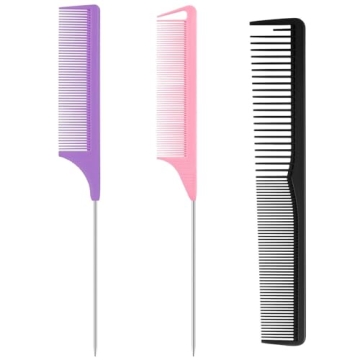 3Pcs Metal Pin Combs Set: Long Rattail & Parting Combs in Black/Purple/Pink