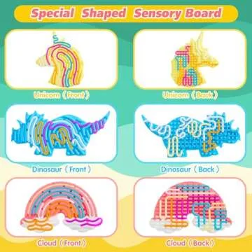 Show more Introducing the 3Pcs Sensory Activity Board — the ultimate fidget sensory toy designed for both kids and adults alike! This innovative activity board stands out from traditional sensory toys with its triple design options featuring dinosaurs, unicorns, and clouds. Each board offers a unique tactile experience aimed at enhancing children’s fine motor skills, hand-eye coordination, and creativity through engaging activities like pushing, peeling, and tying. Its vibrant colors and intricate designs can captivate anyone's attention, making it a fantastic tool for cognitive growth and creative play.