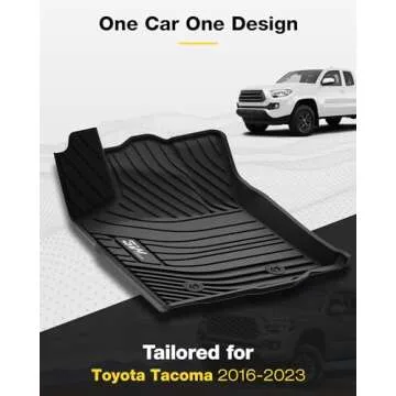 Show moreIntroducing the 3W Floor Mats Fit for Toyota Tacoma 2016-2023, designed specifically for Double Cab and Automatic transmission models. These premium floor mats utilize cutting-edge 3D scanning technology, ensuring a custom-fit that perfectly aligns with your vehicle’s dimensions. This means no more gaps—just seamless protection against all kinds of debris and spills. Crafted to suit 1st and 2nd-row seating, these liners not only enhance your Tacoma’s interior but also offer unparalleled durability and style with their sleek black finish.