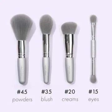 Imagine carrying four high-quality brushes that fit into the palm of your hand. The set includes a #35 blush brush for perfectly applied blush and highlighter, a #15 dual-ended eyeshadow brush for versatile shadow styling, a #45 powder brush for shine control and bronzing, and a #20 stippling brush designed for blending cream products effortlessly. Each piece has been designed for ease of use, making your makeup application a breeze, whether at home or traveling.