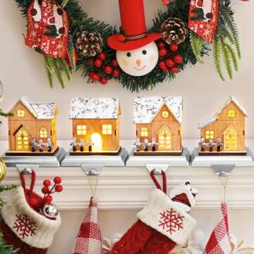 4 Pack Christmas Stocking Holders for Mantle - LED Lighted Wood Hangers with House Design