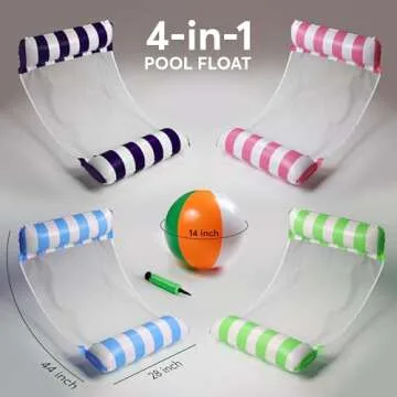 4 Pack Inflatable Hammock Pool Floats with Air Pump and Ball. 4-in-1 Design Conversion. Adult Size Pool Floaties Toys, Multi-Purpose Floats for Swimming Pool, Saddle, Lounge Chair, Hammock, Drifter.