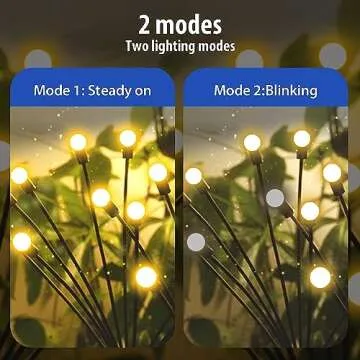 Show moreImmerse yourself in the enchanting glow of the 4 Pack Solar Firefly Lights, where innovation meets elegance. These newly upgraded garden lights not only beautify your outdoor spaces but also provide a functional and inviting ambiance with their warm white hue. With the gentle sway mimicking fireflies, these lights create a whimsical atmosphere that's perfect for cozy evenings or festive occasions in your garden, patio, or yard.