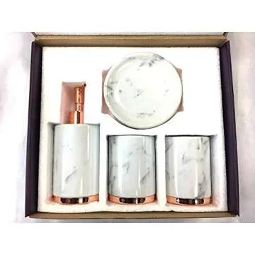 Stylish 4-Piece Ceramic Bath Accessory Set - Marble Look Rose Gold White