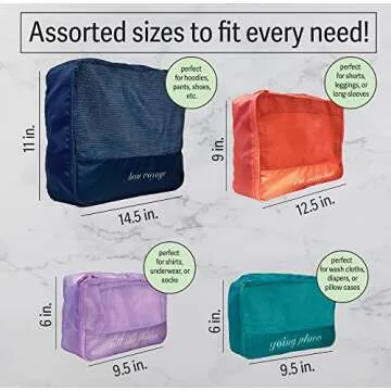 Show moreIntroducing the 4 Piece Colorful Packing Cubes for Travel, an essential travel companion that combines functionality with fun! These packing cubes showcase delightful sayings on each cube, making organizing your suitcase a joyful experience. Designed with vibrant colors and various sizes, they serve as the perfect solution to keep your belongings neat and accessible. Whether you’re an avid traveler or a casual vacationer, these packing cubes ensure that finding your essentials is a breeze, especially with our color-coded system.