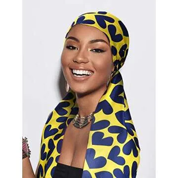 The vibrant, charming colors of our African printed edge wraps incorporate a mix of yellow, red, black, and more, giving you the option to express your individuality and enhance your beauty. Knot it in various shapes to showcase your personal style, making every outfit pop with color and flair.