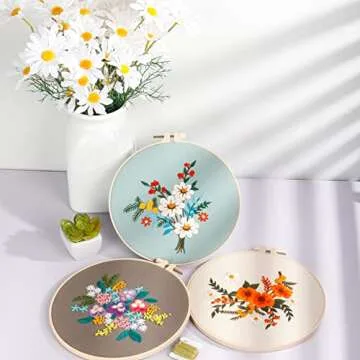 Show more If you're on the lookout for a delightful gift that captures creativity and artistry, then this comprehensive embroidery starter kit is the perfect choice! Designed with beginners in mind, this kit encompasses everything you need to embark on your embroidery journey. Each of the four included embroidery cloths features beautiful, pre-printed flower patterns, perfect for adding a touch of elegance to any home décor.