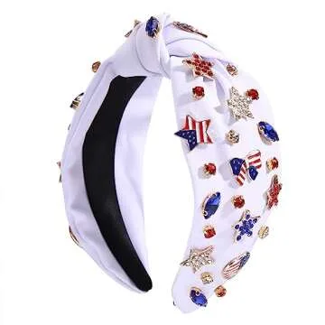 4 th of July Headband for Women American Flag Knottted Headband Star USA Charm Fourth of July Patriotic Headband Headpiece Red White and Blue Crystal Top Knot Wide Hairband Hair Accessories Gift (white patriotic headband)