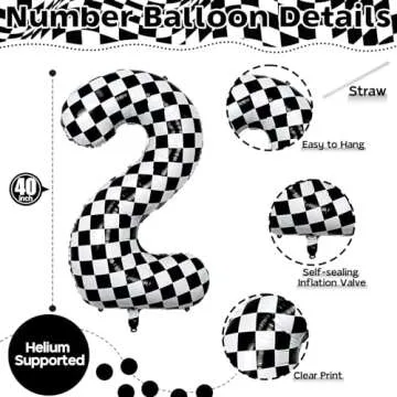 40 Inch 2nd Birthday Number Balloon, Checkered Foil Self Inflating 2 Balloons Decor, Big Black and White Racing Helium Number 2 Balloons for Girls Boys Birthday Race Car Flag Party Decoration Supplies