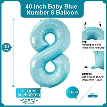 Show more Celebrate life's special moments with our stunning Giant 40 Inch Baby Blue Number 8 Balloon. Crafted from high-quality mylar material, this impressive foil balloon is designed to provide long-lasting enjoyment. It's perfect for creating a vibrant birthday backdrop or adding flair to any special event.