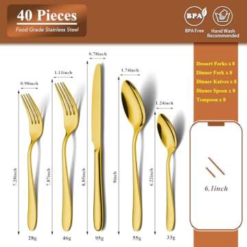 Show more Elevate your dining experience with the 40 Piece Gold Silverware Set Service for 8 by EIUBUIE. This exquisite flatware set includes everything you need for a beautifully set table: 8 dinner knives, 8 dinner forks, 8 dinner spoons, 8 salad/dessert forks, and 8 dessert/teaspoons, all beautifully packaged in a sturdy cardboard box. Crafted from high-quality food-grade stainless steel, this set promises not only aesthetic appeal but also safety and durability for any occasion.