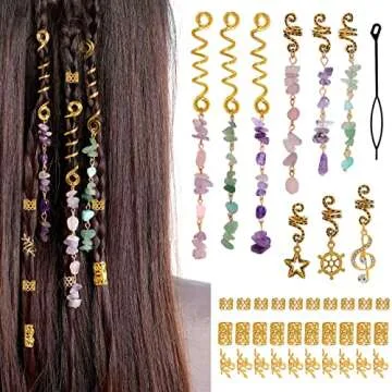 40Pcs Hair Jewelry for Braids, hoyuwak Natural Colored Crystal Stone Hair Braid Accessories Metal Hair Charms Gold Loc Dreadlock Spirals Cuffs Rings for Women Girls Rave Festival Hairstyle Decoration