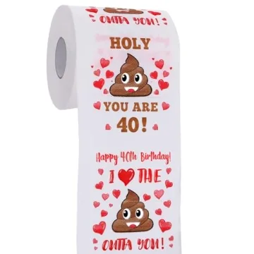 Introducing the ultimate funny toilet paper gift that is guaranteed to evoke laughter and joy at any 40th birthday celebration! This cleverly designed novelty item showcases hilarious phrases such as 'Holy S**t, YOU ARE 40!' and 'Happy 40th Birthday, I LOVE THE S**T OUTTA YOU!'. Each sheet features bright, clear imaging that ensures the humor continues throughout the entire roll, far surpassing other products that only feature jokes on the top sheet. Crafted...