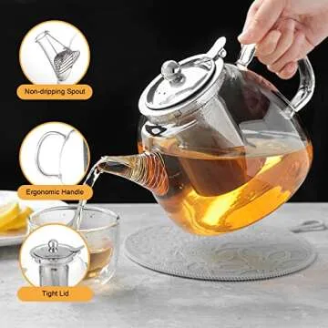 Why You Will Love This Product: Imagine hosting a delightful tea afternoon where every pour is crisp and clean. This glass teapot not only makes that possible, but it also evokes feelings of warmth and sophistication. This elegant piece enhances your tea-drinking ritual, transforms your kitchen into a space of serenity, and adds an inviting touch to your gatherings. Enjoy the moments, knowing that with our teapot, every cup is perfect.