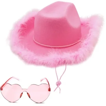 Show more Introducing the ultimate accessory set for trendsetters and playful spirits alike! The 4E's Novelty Pink Cowboy Hat with Feathers and Heart Shaped Sunglasses seamlessly combines fun with functionality. Crafted from high-quality felt, the pink cowboy hat boasts a fluffy feather boa that embellishes the brim, offering a touch of whimsy and a pop of color. With an inner circumference of 58cm (22.8 inches), this hat fits comfortably on both adults and teen girls, ensuring everyone can embrace their inner cowgirl. Whether you're attending a lively party, a vibrant photoshoot, or simply stepping out for a fun-filled day, this striking set will elevate your style and draw admiration.