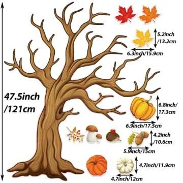Show more If you're searching for a delightful and interactive decoration that captures the essence of fall, look no further than this stunning tree bulletin board cutout set. This enchanting product consists of a large tree made from 15 individual pieces, creating a magnificent structure measuring 120 x 105 cm (47 x 41 inches). Included in the set are 45 vibrant maple leaves in three captivating colors and an array of 14 other autumn-themed cutouts, featuring pumpkins, hedgehogs, mushrooms, and pine cones, ensuring a comprehensive fall-themed display. With 120 glue point dots to assist in assembly, decorating has never been easier!