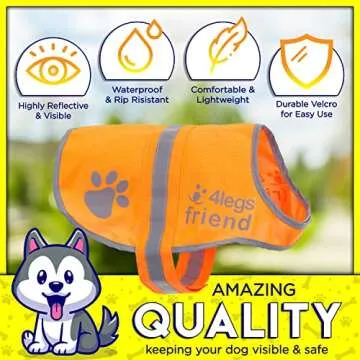 Show more Experience unparalleled safety and style for your beloved pet with the high visibility reflective vest! This jacket is specifically designed to ensure your dog remains visible during early morning and late evening walks, giving you peace of mind. With an eye-catching modern hi-vis orange blaze color and reflective prints that can be seen from up to 500 feet at night, this vest is the perfect companion for your outdoor adventures.