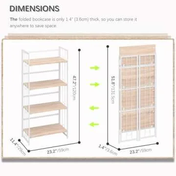 4NM No-Assembly 4 Tiers Folding Bookshelf Storage Shelves Vintage Bookcase Standing Racks Study Organizer Home Office - Natural and White