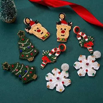 Show more Get ready to shine this holiday season with our exquisite 4 Pairs Christmas Earrings Set. This carefully curated set features stunning handmade earrings shaped like Christmas trees, snowflakes, reindeer, and festive wreaths, adorned with vibrant red, green, and gold beadwork. Each piece is meticulously crafted with rhinestone accents, ensuring you sparkle at every holiday gathering. Perfectly sized at approximately 2.3-2.7 inches in length, these dangle earrings make a stylish statement while enhancing your festive attire. Whether you’re donning a cozy ugly sweater or an elegant cocktail dress, these earrings are the ideal accessory to elevate your Christmas spirit.