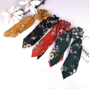 Show more Introducing the AILEAM Printed Scarf Pony—a delightful set of 4 floral print pony scarves that instantly elevate your hairstyle! These vibrant and stylish hair accessories are designed with versatility in mind, allowing you to express your personality in countless ways. Whether you're dressing up for a special occasion or simply adding flair to your everyday look, these scarves are a charming touch. The luxurious feel of the silk-like fabric makes them a standout choice for all hair types, effortlessly transforming any basic ponytail into an eye-catching statement.