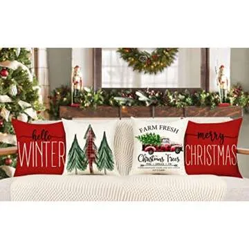 4TH Emotion Red Christmas Pillow Covers 18x18 Set of 4 Farmhouse Christmas Decorations Merry Christmas Tree Truck Hello Winter Holiday Decor Throw Cushion Case for Home Couch S22C34