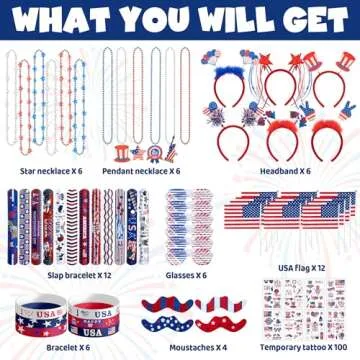 4th of July Party Favors Set, Fourth of July Decorations 158 Pcs Accessories Includes Slap Bracelets, Necklaces, USA Flags, Tattoos, Wristbands, Glasses, Headbands, Moustaches, Red White and Blue