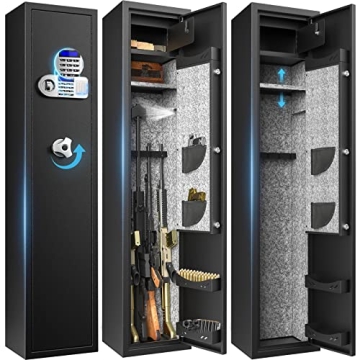 Show moreThe Riddost 5-6 Rifle Gun Safe is meticulously designed for responsible gun owners who prioritize security, functionality, and style. Specially crafted to accommodate up to six rifles measuring 46 inches or less, this safe provides ample space not only for your firearms but also for valuable accessories. Its robust cold-rolled steel construction ensures durability and protection, preventing unauthorized access while maintaining a sophisticated aesthetic that complements any home décor. The innovative LCD display serves as a modern touch, providing real-time information on battery life and access status—an essential feature for maintaining peace of mind.