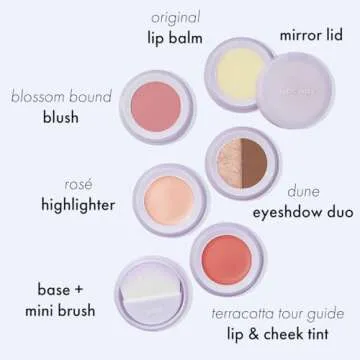 5-in-1 travel makeup kit by subtl beauty | eyeshadow duo, powder blush, cream highlighter, lip and cheek, lip balm | free travel mirror and brush | stackable makeup for travel