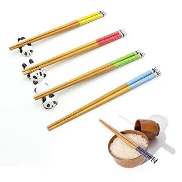 5 Pairs Chopsticks and Chopstick Rest Set, Cute Panda Chopsticks Holder 3 Pcs, Classic Japanese Style Bamboo Natural Reusable Chopsticks, Dishwasher - Safe, Chopsticks Holder Gift Set (Panda)