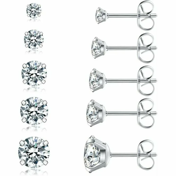 5 Pairs Hypoallergenic CZ Stud Earrings – Stainless Steel 🌟