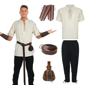 Show moreStep into a world of elegance and adventure with our 5 Pcs Men Halloween Renaissance Cosplay Set. This exquisite medieval pirate ensemble is not just a costume; it's a gateway to the past, inviting you to embody the spirit of nobility and adventure. The set features a vintage men's medieval shirt, sophisticated renaissance gothic pants, stylish faux leather arm guards, an adjustable belt, and a charming leather drawstring pouch, all crafted to ensure you stand out at any event.