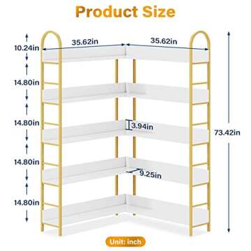 Show more Introducing the exquisite 5-Tier Gold Bookcase, an elegant L-shaped corner bookshelf designed to seamlessly fit into any space while maximizing your storage potential. With its stunning mixture of white and gold, this bookshelf isn't just furniture; it's a statement piece. Measuring 35.55”L x 35.55”W x 73.43”H, its ten generously-sized shelves provide ample room for your cherished books, decorative models, and personal memorabilia. The modern aesthetic makes it a perfect addition to both contemporary and traditional décor, ensuring your home remains stylish and inviting.