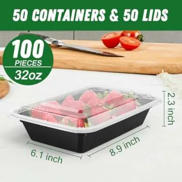 50 Pack (100-Piece) 32 oz Meal Prep Containers Reusable with Easy Open Lids, Sturdy Leakproof Food Safe, Microwave Freezer Dishwasher Safe, To Go Take Out Plastic Food Storage Pans with Lids, Black