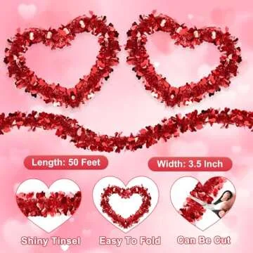 Show more Transform your Valentine's Day with this stunning 50-foot long garland, adorned with shimmering metallic tinsel and charming heart-shaped foil ornaments. This beautiful piece is designed to catch and reflect light, creating a mesmerizing display that instantly adds a romantic touch to any setting. Crafted from premium metallic tinsel, this garland is not only visually appealing but also robust, ensuring it remains a centerpiece in your decor for years to come.