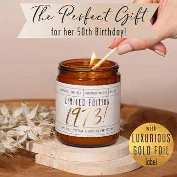 Gifting the **Limited Edition 1973 Soy Candle** isn’t just about providing a beautiful product; it’s about delivering joy and tranquility to the one you cherish. This candle will remind her of her fabulous journey through the years and the exciting adventures that lie ahead. Not only does it serve as a wonderful aromatic experience, but its thoughtful design also encourages an atmosphere of reflection and celebration. Watch her smile grow as she indulges in this luxurious gift, perfectly aligned with the essence of her remarkable 50 years!