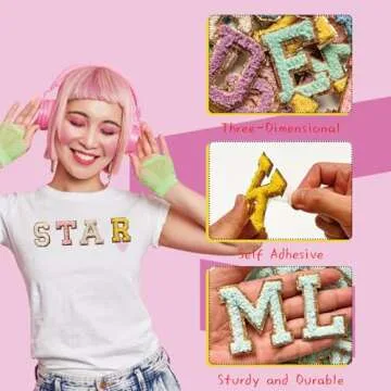 Show more Unleash your creativity with our 52 Pieces Self Adhesive Chenille Letter Patches. These vibrant, multicolored patches are designed to help you personalize and beautify your belongings. Each patch features a stunning golden edge and shimmering gold glitter, making them not only practical for repairs and embellishments but also a fabulous addition to your fashion statement. Made from high-quality chenille, these letters are durable and well-made, ensuring that they resist wear and fading over time. The self-adhesive back makes application a breeze—simply peel, stick, and go! With letters from A to Z, you have the freedom to create unique designs on jackets, backpacks, hats, and more in any style you desire.