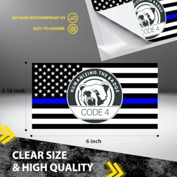 Show moreIntroducing the **5PCS Thin Blue Line Sticker Code 4**, a stunning collection of premium decals designed exclusively for those who want to display their unwavering support for law enforcement. Each sticker showcases a bold and vibrant American flag associated with the emblematic Thin Blue Line, celebrating our heroes in uniform. These decals are not just aesthetically pleasing; they are crafted from **100% premium vinyl** with **military-grade durability**, ensuring they withstand even the toughest weather conditions while retaining their vivid colors. The generous size of each sticker, at **6 x 3.16 inches**, ensures your message is seen and appreciated from a distance, making them perfect for a variety of surfaces, including vehicle bumpers, windows, and laptops.