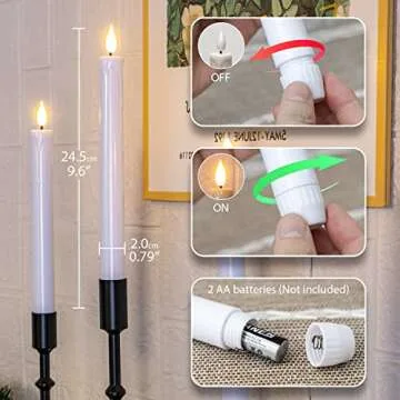 Each set includes three taper candles, equipped with advanced features that cater to your needs. With the included 10-key remote control, adjusting the flicker pattern, brightness, and setting the timer (2/4/6/8 hours) has never been easier. Powered by two AA batteries (not included), these candles provide a super long battery life, lasting over 30 days on a single set of batteries. Say goodbye to the hassle of wax drips and fire risks, and enjoy peace of mind with a product made to last.