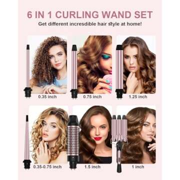Show more Introducing the 6 in 1 Curling Iron Set, your ultimate hair styling solution that equips you with the versatility to create a multitude of stunning looks right at home. This innovative set features five interchangeable ceramic curling wands ranging from 0.35 inch for tight curls to 1.25 inch for loose, voluminous waves, along with a 1.5 inch curling brush designed to add body and texture to your hair. Crafted with advanced materials and technology, it promises not only fabulous styles but also hair care. This is your go-to styling companion, so get ready to embrace your confident self and shine with a fresh look every day!