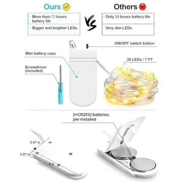 Show more Transform your space with our enchanting 6 Pack Battery Operated LED Fairy Lights. These miniature lights, with a length of 7 feet and equipped with 20 upgraded energy-saving LEDs, are perfect for bringing a cozy glow to any setting. Powered by 2 CR2032 batteries (included), they are designed for long-lasting use, illuminating your space for over 72 hours without interruption.
