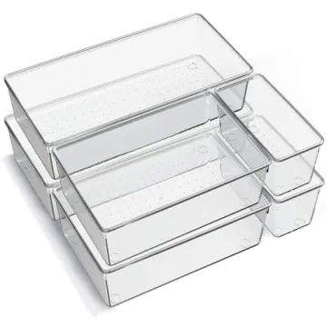 Unlike other drawer organizers that are often fragile and poorly made, our 6 Pack Clear Drawer Organizers stand out due to their superior materials and design. Made of food-grade quality PET, our trays are not only more durable but also safe for food storage. Many competitors lack versatility in size and can be slippery without non-slip features, while our organizers are designed to securely stack, saving you valuable drawer space.