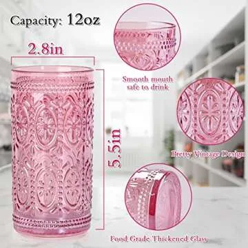 Show moreEmbrace sophistication and charm with our 6 Pack Pink Vintage Glassware Set, designed to elevate your sipping experience to new heights. These exquisite highball glasses, measuring 2.5 inches in diameter and standing 5.5 inches tall, each hold a generous 12 oz capacity. Crafted from durable, food-grade thickened glass, they blend beauty with resilience, ensuring they last for many gatherings to come. The intricate embossed patterns offer a nod to timeless elegance, making them a perfect fit for any modern kitchen or classy event.